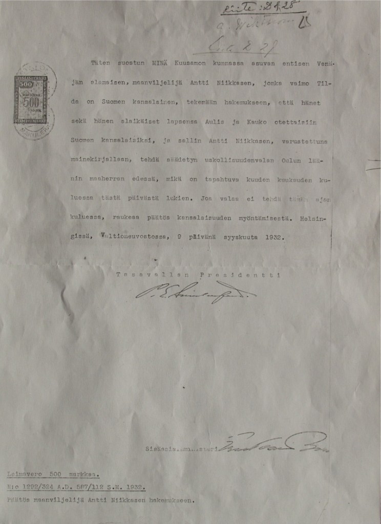 1932-09-09 Antti Niikkonen – Suomen kansallisuus, allekirjoitus Tasavallan Presidentti P.E. Svinhufvud