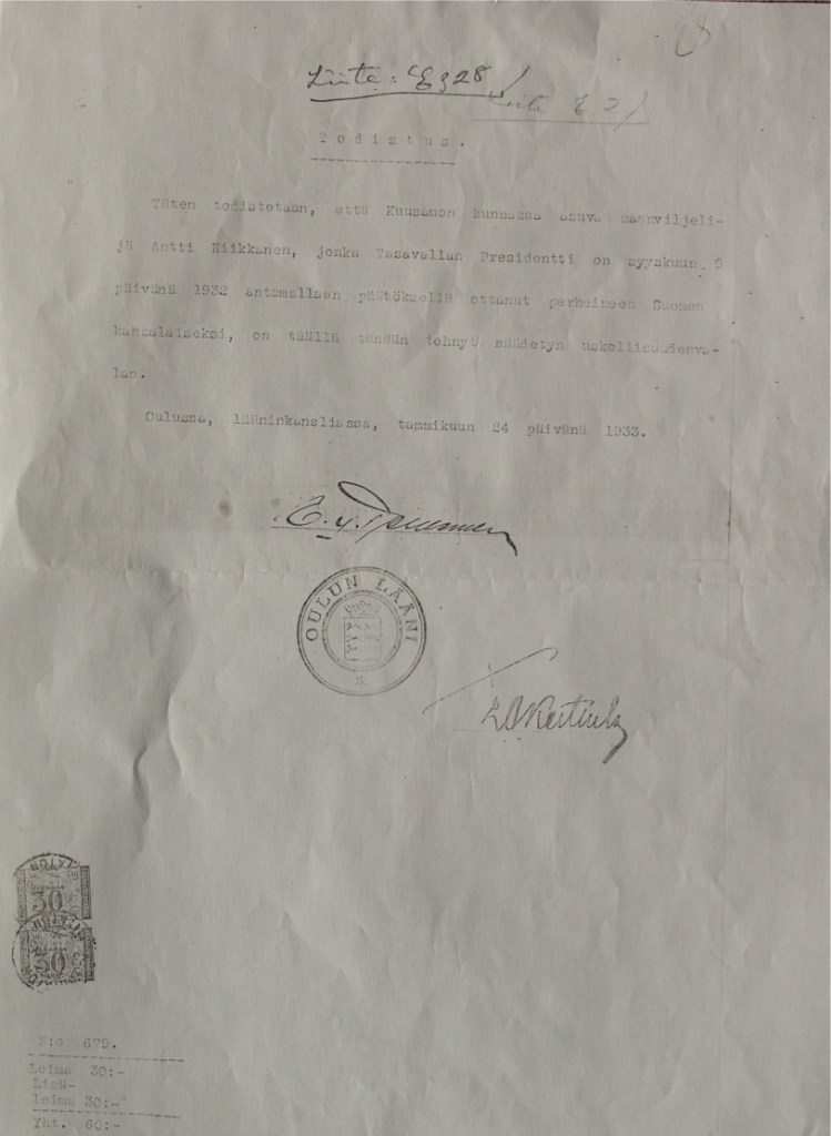 1933-01-24 Antti Niikkonen – uskollisuuden vala, allekirjoitus Oulun läänin maaherra E.Y. Pehkonen